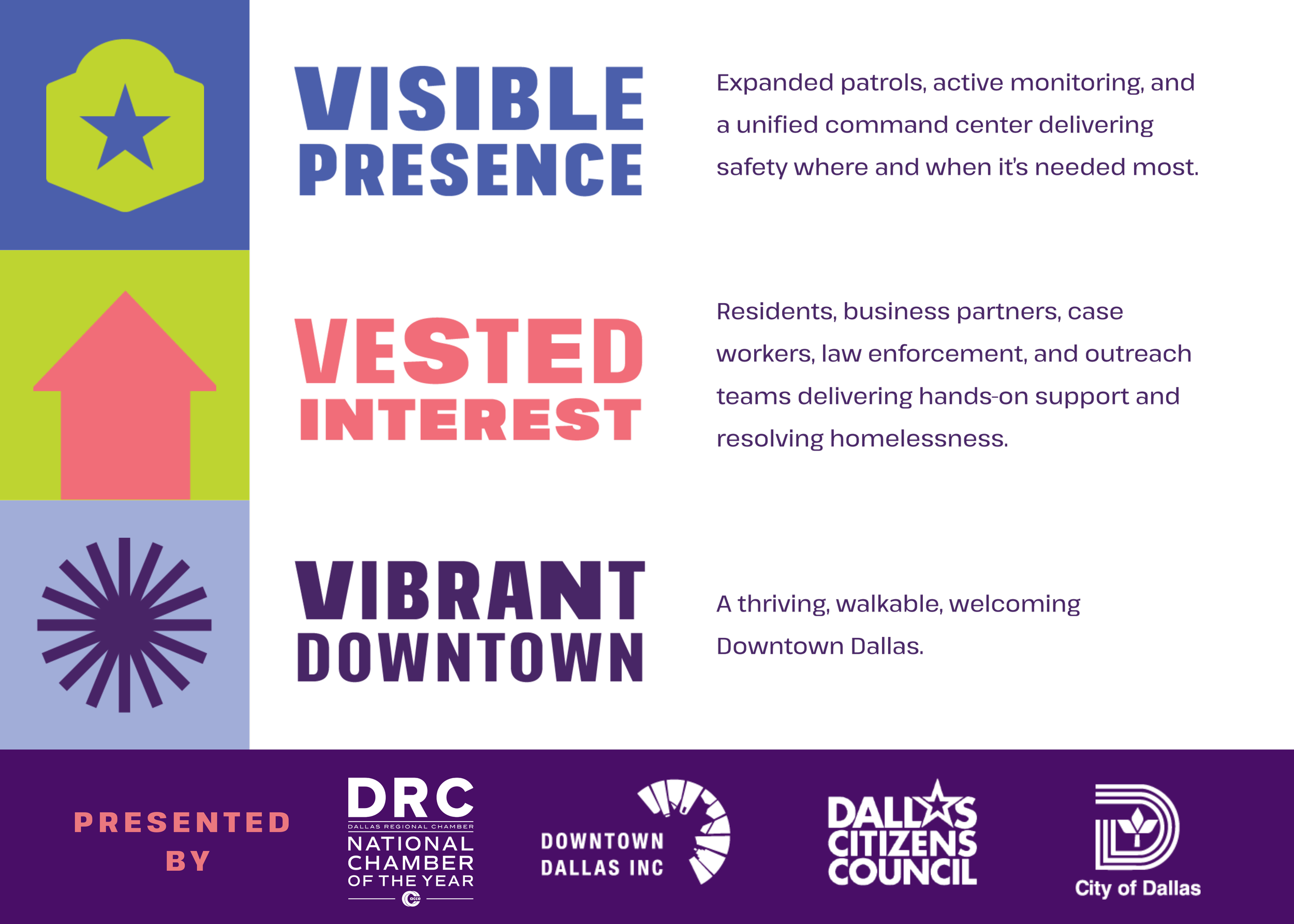 Executing this plan requires strategic partnerships through the newly formed Downtown Safety Coalition, a group of public and private agencies that are united in our commitment to a safe, clean, and vibrant Downtown Dallas.